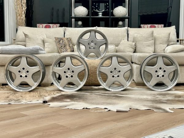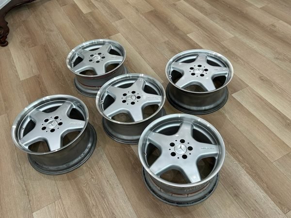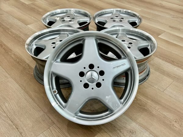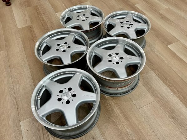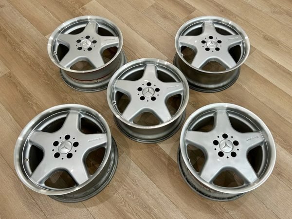 Complete set of 18″ AMG Monoblock Style I Sport wheels — a staggered factory set removed from a Sport R129 (SL500 Sport). This collection includes four road wheels + one full-size spare (spare is a front-sized wheel). The wheels were manufactured in Belgium for Mercedes-Benz, refinished with silver faces and machined lips, and retain factory Mercedes-Benz stamped part numbers and casting marks on the backs.