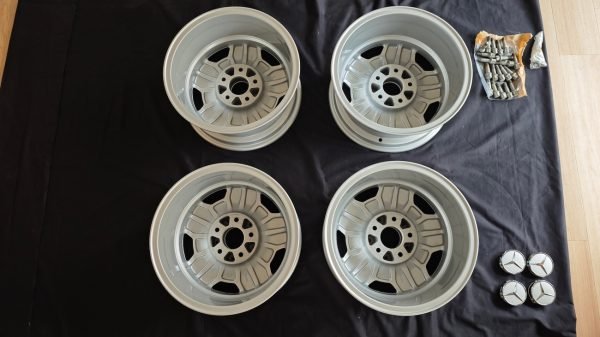 This genuine set of 15″ AMG Aero I Monoblock wheels measures 7″ in width all around and was manufactured exclusively by O.Z. in W. Germany for AMG. These are the desirable early premerger Aero I wheels, featuring the original AMG script without any Mercedes-Benz part numbers. Each wheel carries casting marks C7400127 and KBA41467, confirming authentic pre-merger production.