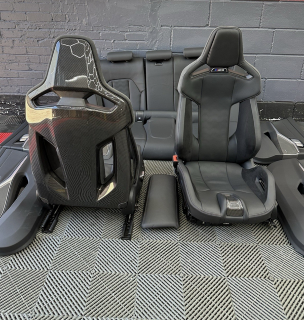 Complete BMW M3 G80/G81 Touring interior set with M-Carbon bucket seats in black Merino leather. Includes 2 front M-Carbon seats, 4 door panels, and full rear bench. OEM, top condition, ready for installation.