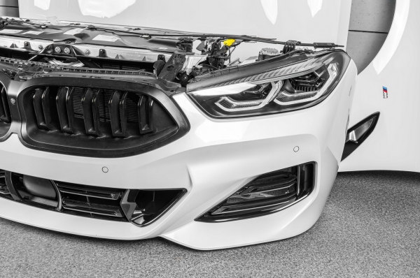 Complete BMW M850i LCI front package in A300 Alpine White Uni — includes bumper, bonnet, fenders, lock carrier with radiator package, and both Adaptive LED headlights with all modules and control units. Fully assembled, as-new condition, ready to fit without repainting.
