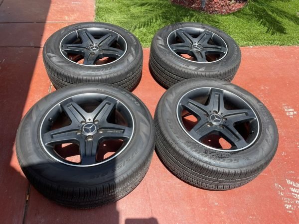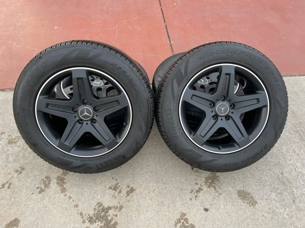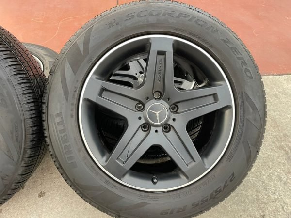 Factory 19″ AMG Wheels & Tires for W463, designed specifically for the W463 Mercedes-Benz G-Class. Each wheel measures 19×9.5 ET50, finished in original matte black with factory AMG face engraving. Authentic Mercedes-Benz casting marks and the correct A463 401 21 02 part number are stamped on the back.