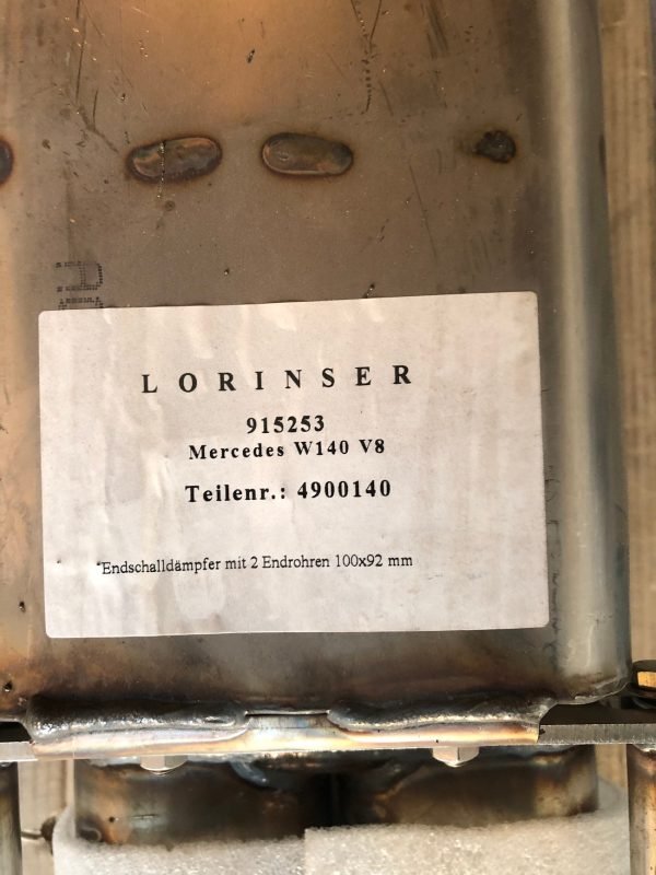 Presented here is an authentic NOS Lorinser Exhaust for Mercedes-Benz W140, designed specifically for all V8-powered sedan models. This system is new old stock (NOS), has never been mounted, and retains its original Lorinser shipping box as delivered to a California tuning shop.