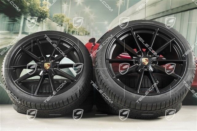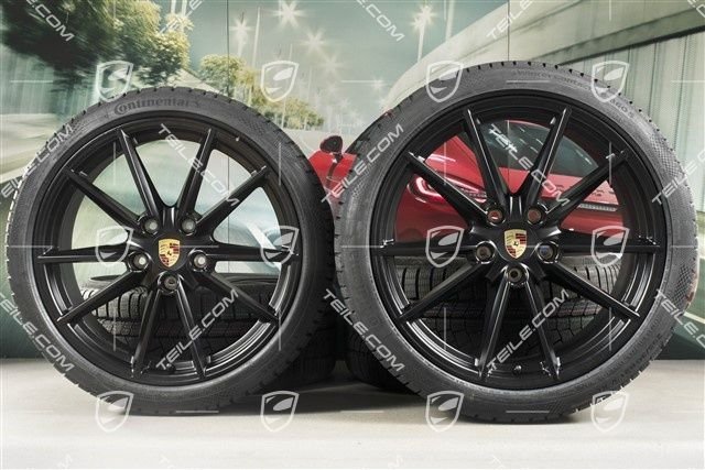 Porsche 911 992 20″+21″ Carrera S Winterräder Satz, Felgen 8,5J x 20 ET53 + 11J x 21 ET66 + Continental Winterreifen 245/35 R20 + 295/30 R21, in Schwarz Seidenmatt.