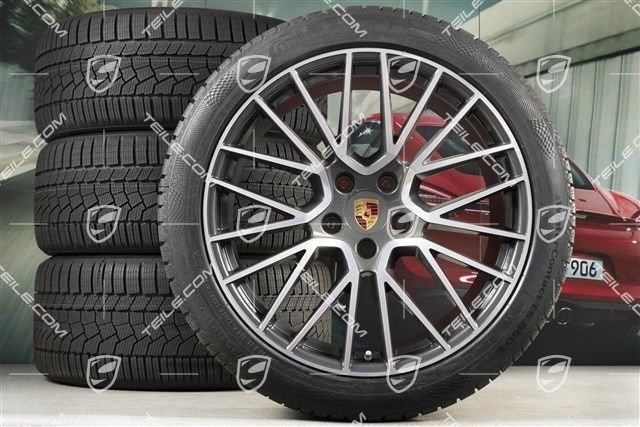 Porsche Cayenne E3/9Y0 21″ Cayenne RS Spyder Winterräder Satz, Felgen 9,5J x 21 ET46 + 11,0J x 21 ET58 + Continental Winterreifen 275/40 R21 + 305/35 R21, mit RDK-Sensoren, Titanium.
