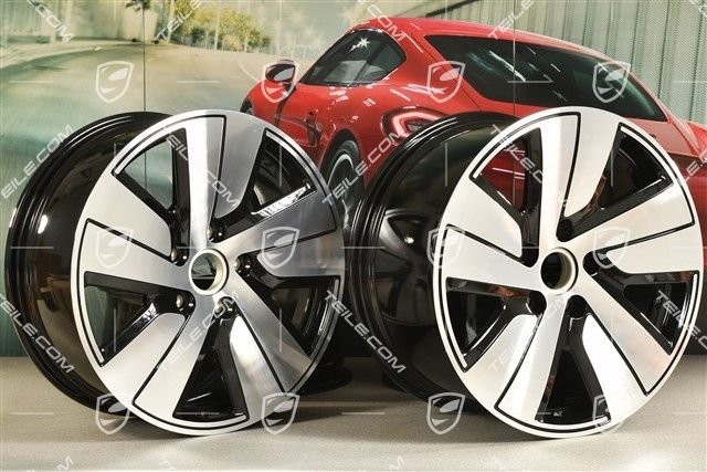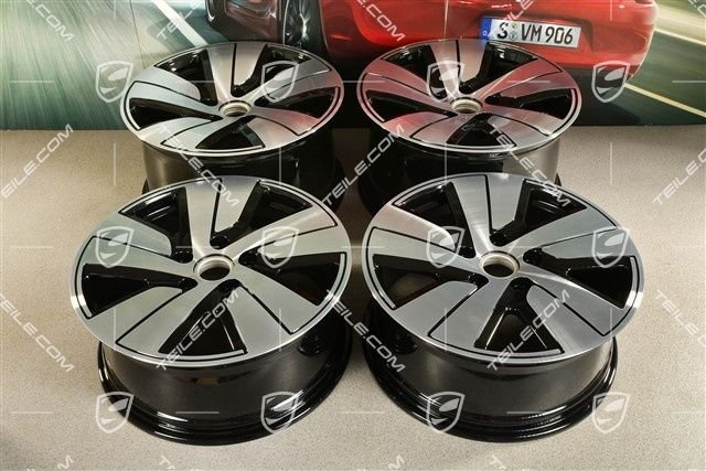 Porsche Taycan 19″ Felgensatz Taycan S, 8J x 19 ET50 + 10J x 19 ET47, schwarz hochglanz mit glanzgedrehter Stirnfläche.