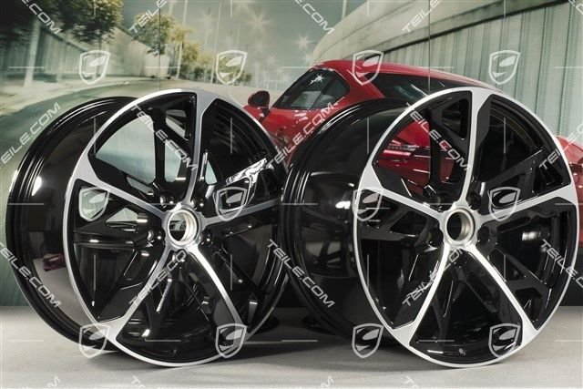 Porsche Taycan 21″ Felgensatz Cross Turismo Design, 9,5J x 21 ET60 + 11,5J x 21 ET66, schwarz hochglanz mit glanzgedrehter Stirnfläche.