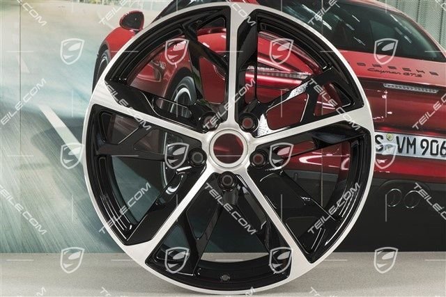 Porsche Taycan 21″ Felgensatz Cross Turismo Design, 9,5J x 21 ET60 + 11,5J x 21 ET66, schwarz hochglanz mit glanzgedrehter Stirnfläche.